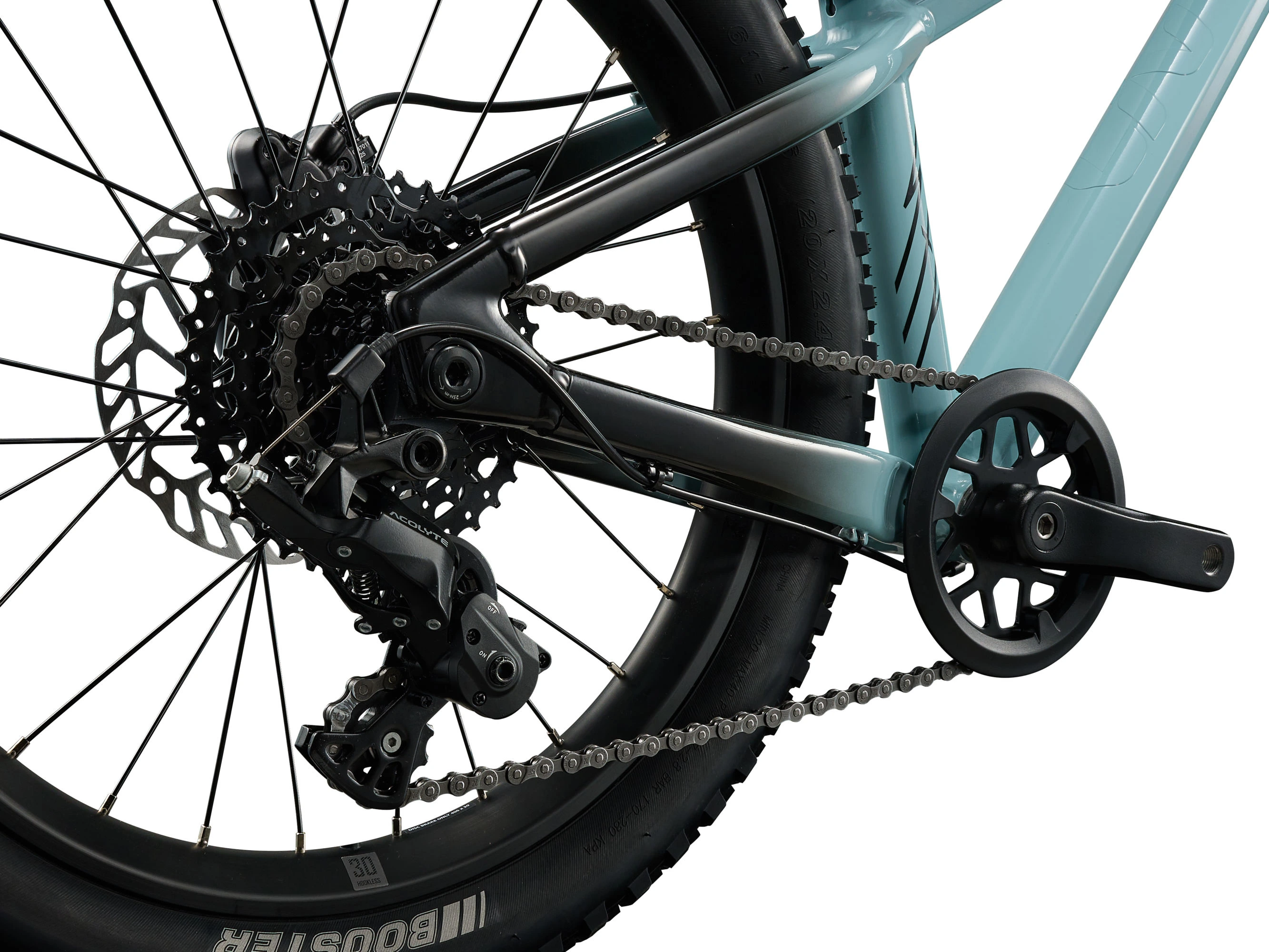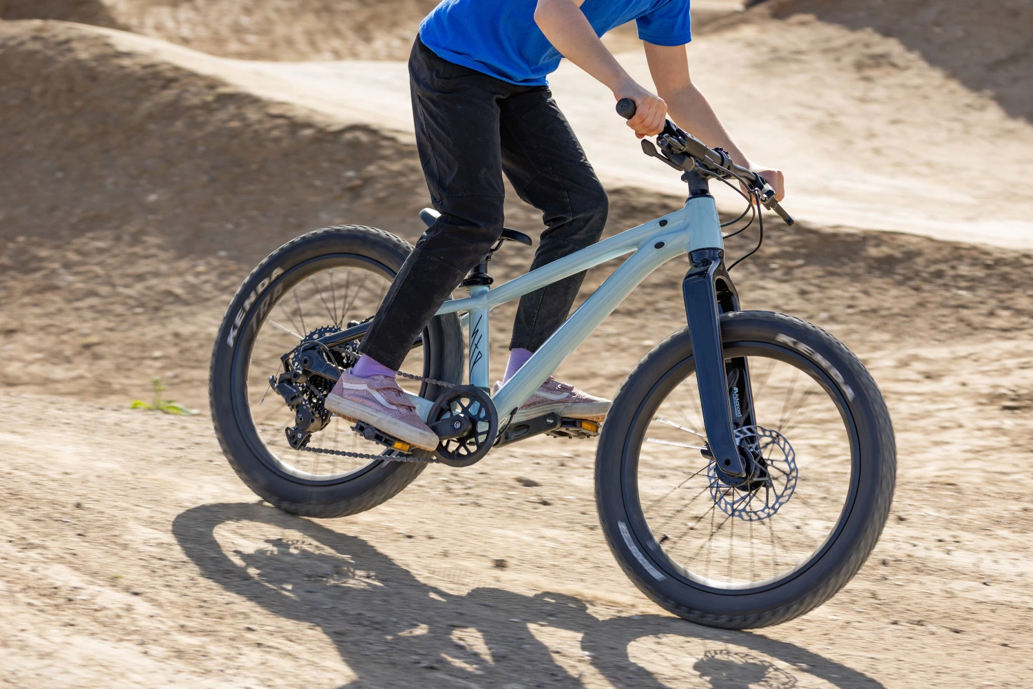 Intuitivní řazení: Systém MicroSHIFT Acolyte 1x8 s krátkým vodítkem přehazovačky minimalizuje riziko nárazu o terén a nabízí jednoduché ovládání pomocí páček, které zvládnou i dětské palce.