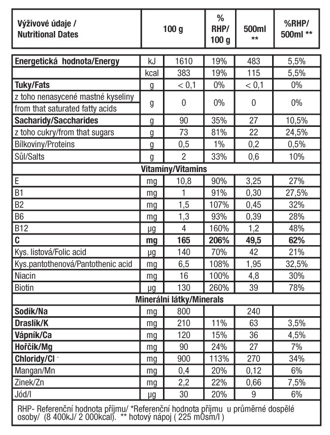 , Zn, Fe, Cu, aj. Jako pohotový zdroj energie dodává zatěžovanému organizmu jednoduché sacharidy a polymery glukózy (maltodextriny). Aby se plně uplatnily tyto přednosti, jimž za výjimečné výkony vděčí řada mistrů světa a olympijských vítězů, doporučujeme PENCO® MINERAL DRINK připravovat v mírně hypotonické koncentraci, s jeho pitím začít již před výkonem a během výkonu pít každých 10-15 minut malé dávky, asi 100-150 ml.